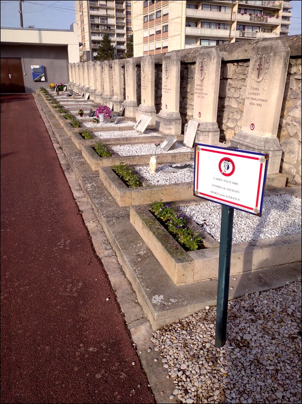 Dès l’entrée, sur la droite le long du mur, les tombes réservées aux soldats morts à la seconde guerre mondiale ainsi que celles de résistants dont on peut retrouver leurs noms sur les plaques de rues. Face à ces sépultures, une stèle à leur mémoire, une première fut inaugurée le 28 avril 1968 et remplacée en la réactualisant le 28 mai 2016. Une stèle à la mémoire des déportés fut inaugurée le 29 avril 1979 dans le parc de la mairie.
