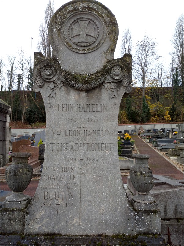 Plus haut, une stèle à son sommet une croix dans un cercle, nous y lisons Léon Hamelin 1782-1868, cousin de Ferdinand Hamelin, amiral de France et ministre de la marine inhumé aux Invalides et neveu de Félix-Emanuel Hamelin officier de marine. Il vécu et mourut dans la maison de ce dernier.